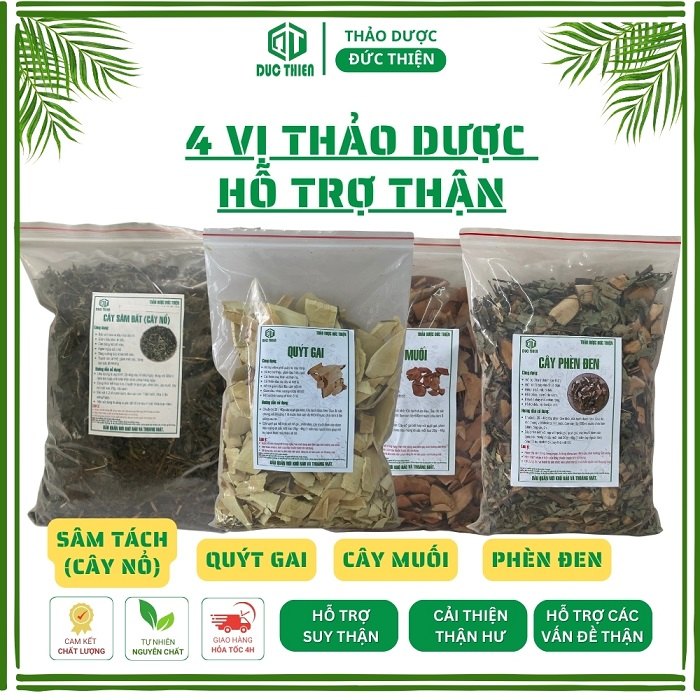 Combo gồm 4 vị thảo dược là: cây muối, quýt gai, phèn đen và nổ gai, đều là các vị thuốc dân gian có công dụng hỗ trợ điều trị các vấn đề về thận, tiết niệu, tiểu rắt, suy thận và thanh lọc cơ thể hiệu quả. Mỗi vị được đóng 500g, sử dụng độc lập hoặc kết hợp theo liệu trình.