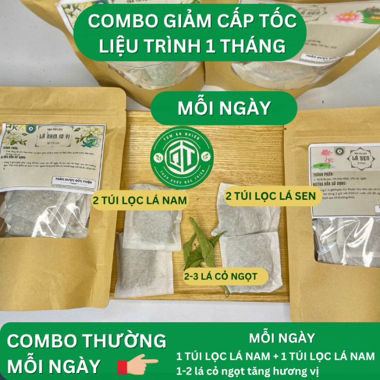 👉 30 ngày cấp tốc: 2 gói Trà Lá Sen (1 gói chứa 30 túi lọc), 2 gói Trà Lá Nam 10 Vị (1 gói chứa 30 túi lọc), 1 gói cỏ ngọt 50gr