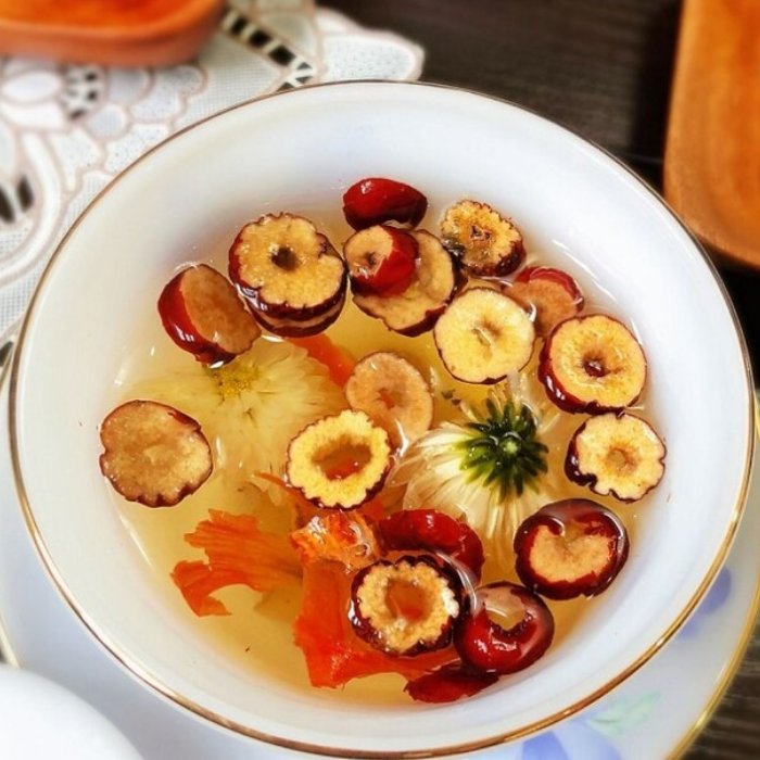 Chuẩn bị: 15 hạt kỷ tử đỏ + 3 quả táo đỏ (thái lát) + 5-7 bông cúc khô (hoặc nụ nhài).