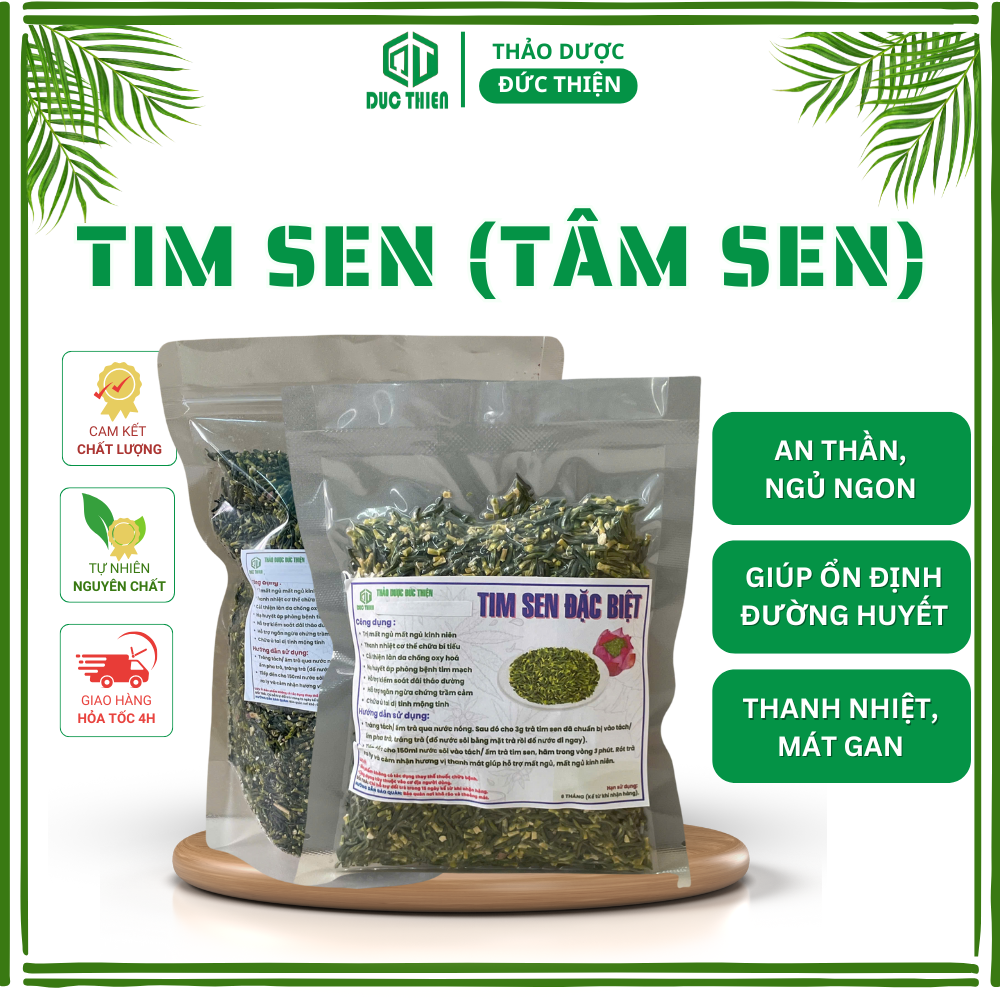 Tim sen (hay còn gọi là tâm sen) là phần mầm màu xanh nằm bên trong hạt sen già, được xem như một loại dược liệu quý trong Đông y. Trà tim sen thường được dùng như một phương pháp an thần tự nhiên, giúp ngủ ngon và thanh lọc cơ thể.