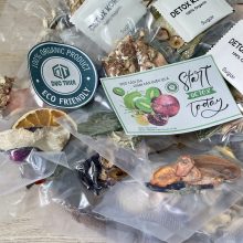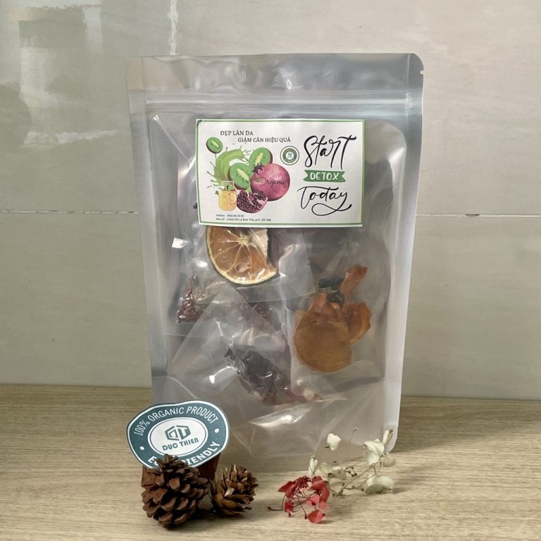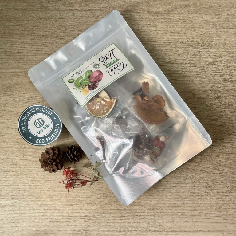 Trà Detox Giảm Cân Thảo Dược Đức Thiện được chế biến từ các loại trái cây sấy khô tự nhiên, giúp thanh lọc cơ thể, đốt mỡ và hỗ trợ giảm cân an toàn. Sản phẩm được đóng túi zip 2 lớp chắc chắn, tiện dụng khi pha và bảo quản.