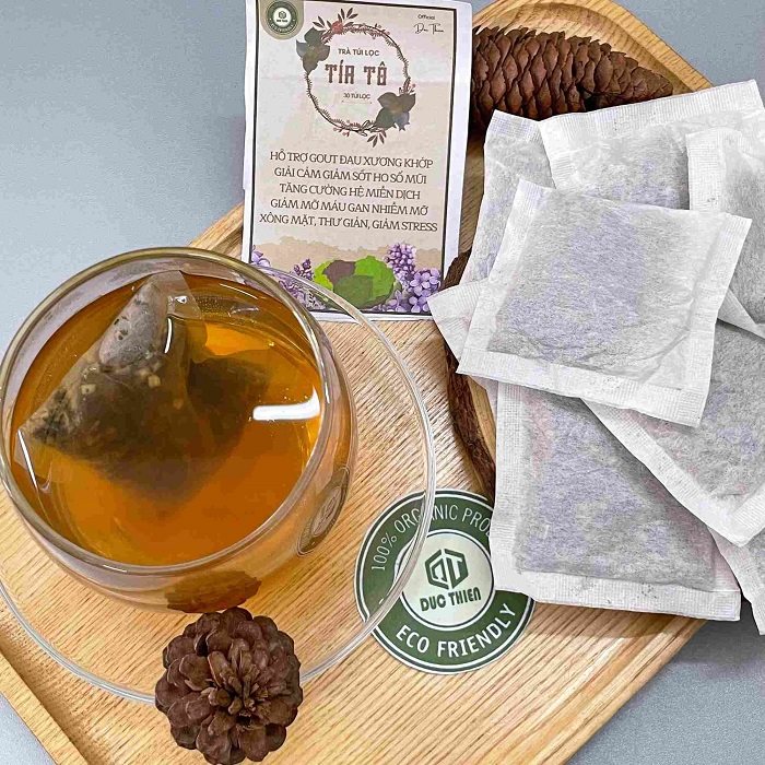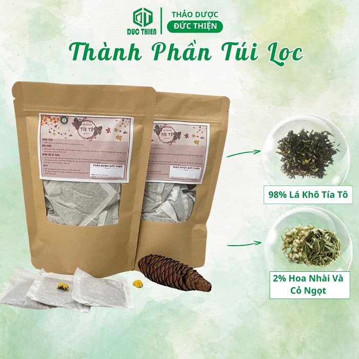 Trà tía tô túi lọc là sản phẩm được tinh chế từ lá và cành non của cây tía tô bánh tẻ. Thay vì sử dụng lá tươi hay lá khô nguyên bản, dược liệu được đem đi nghiền nhỏ theo kích thước tiêu chuẩn và đóng gói vào các túi giấy lọc sinh học tiện lợi.
